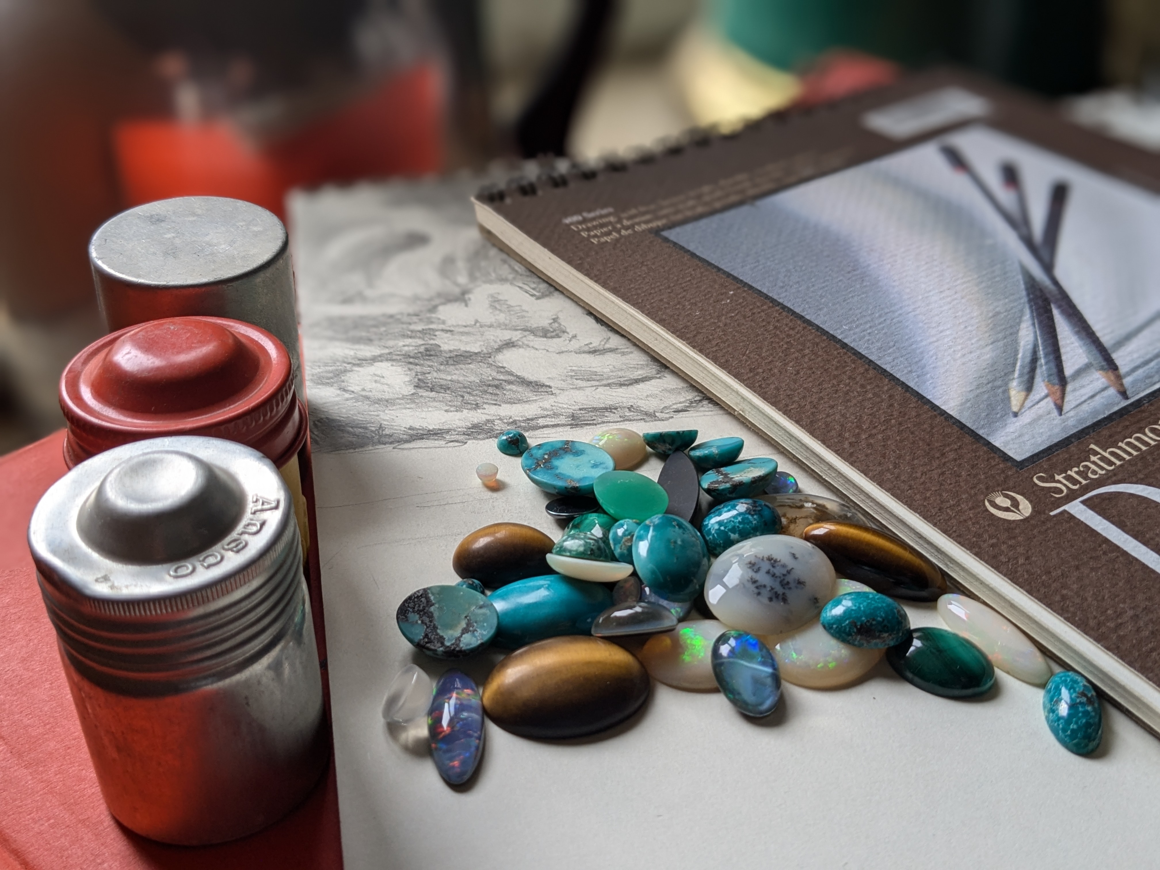 In the midst of organizing, I discovered a box of art supplies, notebooks, sketchbooks, and long-lost treasures from years ago. There were college notebooks and leftover supplies from classes, a sketchbook or two, unfinished jewelry pieces in brass, copper, and silver, and a scrap of Australian cypress I once used to build my favorite table, which has since disappeared. The most precious finds were some cut opals and turquoise stones of Grandpa’s and Nanny’s—stones I thought I had lost.